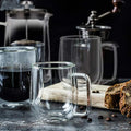 - HUMANITY DESIGN - Thanks to the vacuum between the double wall borosilicate glass that doesn’t conduct heat, the interior coffee will keep hot longer while the exterior wall will stay cool for hand safe touch; Hot drinks will not burn your hands and cold drinks will not form condensation. No burn marks or wet rings will be left on your especially precious leather or wood table. The comfortable, wide opening and thick handle is easy to grasp and especially perfect for the sleepy or shaky hands